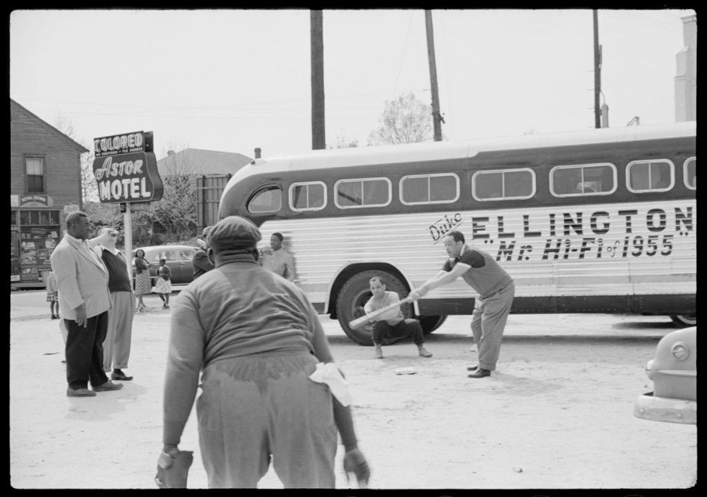 Ruth Crawford Seeger chopping wood on a beach with Carl Sandburg.