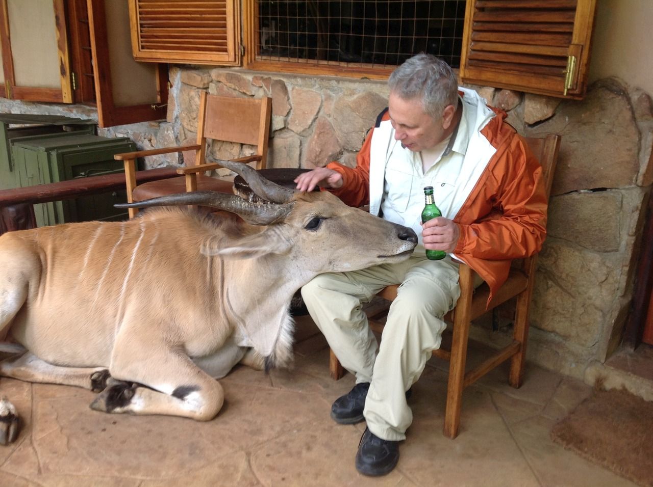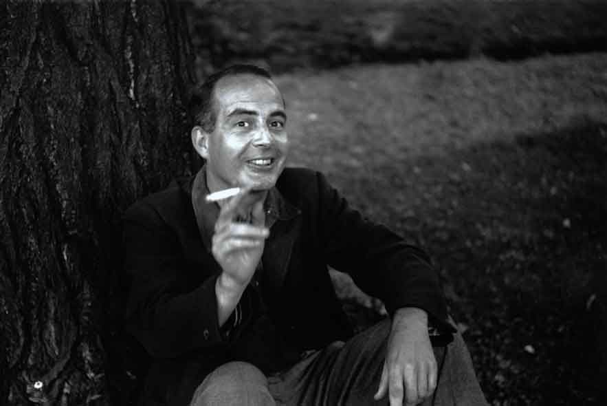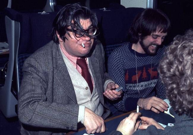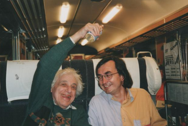 György Ligeti pouring water on Pierre-Laurent Aimard on a train.