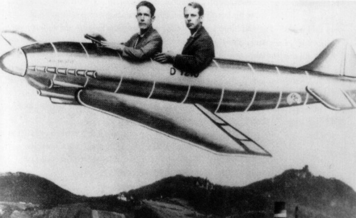 John Cage and Karlheinz Stockhausen flying a cartoon plane.