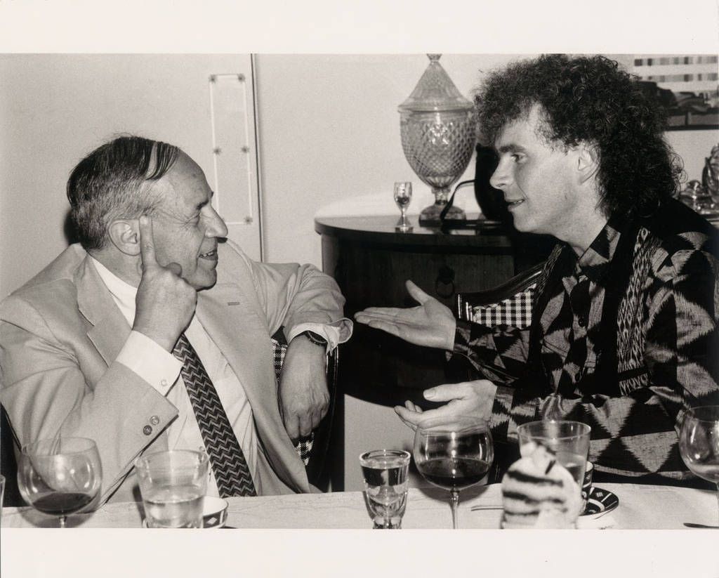 Pierre Boulez and Simon Rattle chatting at a party in 1989.