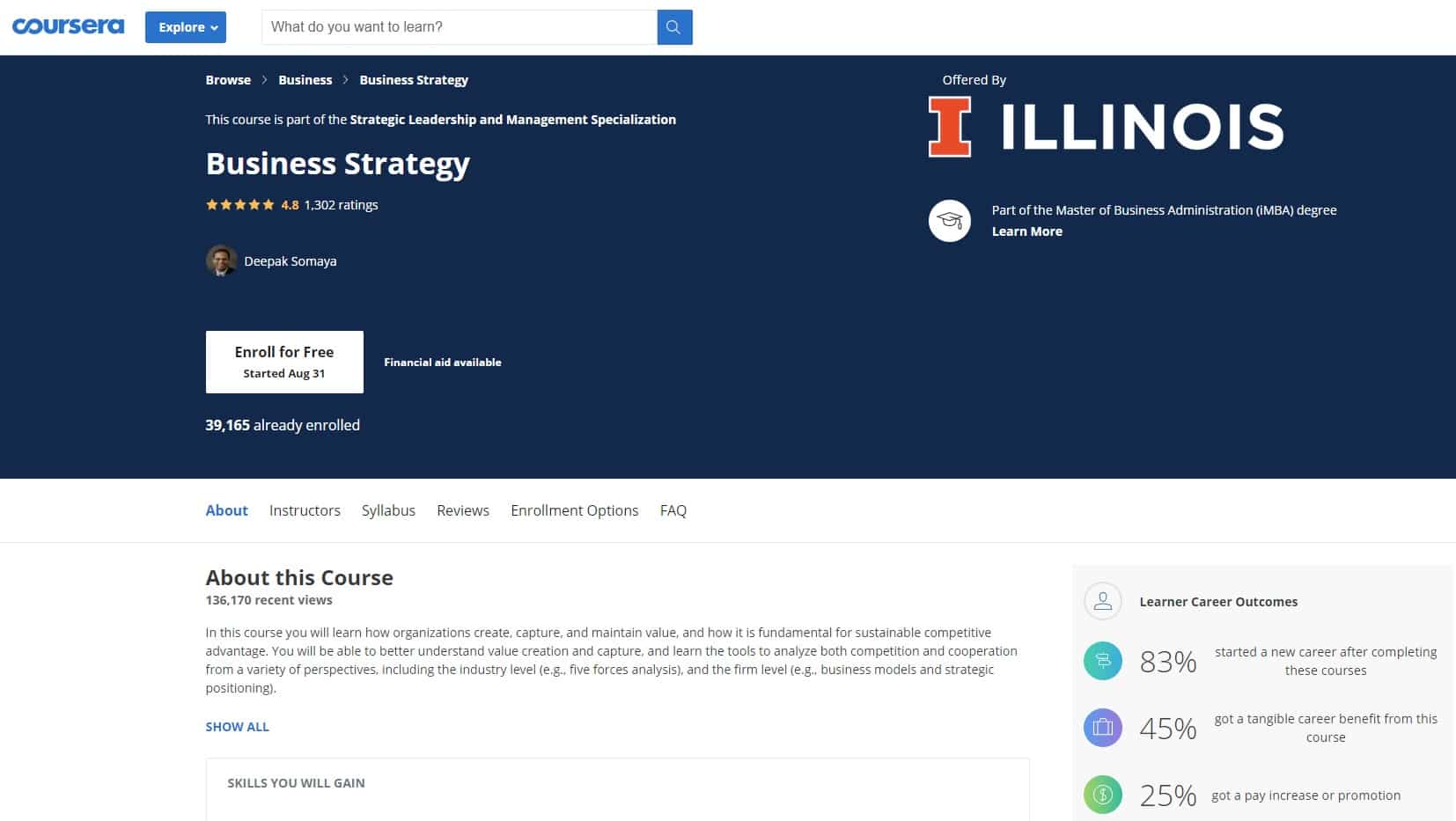 If you don't want to get in tons of concepts and theories and are looking for a simple, to-the-point, and workable approach towards learning business strategies, then this is definitely the course for you. Offered by I Illinois and taught by Deepak Somaya, this course teaches you how to create, capture, and maintain the value for your organization and to use it for gaining a competitive advantage that would sustain.