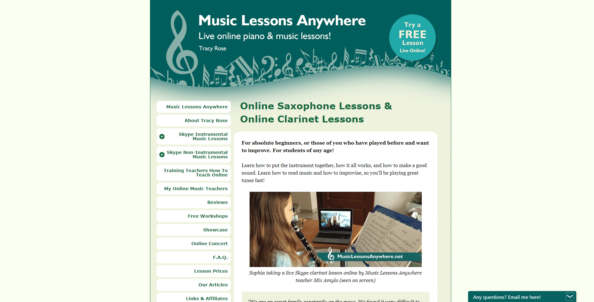 These clarinet lessons are done one-on-one in real-time, unlike others where you get recorded video. The lessons are offered by Mix Amylo on musiclessonsanywhere.net which offers lessons on different musical instruments from different teachers. The lessons are delivered on Skype, which allows you to learn in a Q&A mode. These lessons are designed for learners of all ages; beginner to advanced.