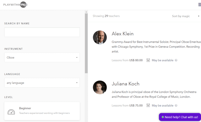 There are some top Oboe teachers listed on Playwithapro.com that can help you learn in no time at all. They might look a bit expensive than other websites offering similar kind of teaching module but it is worth each penny that you will spend learning on this website as all of these teachers are not only the top Oboe artists but also have extensive experience in teaching. Your sessions with them are going to make you feel more confident about your skills and music each day.