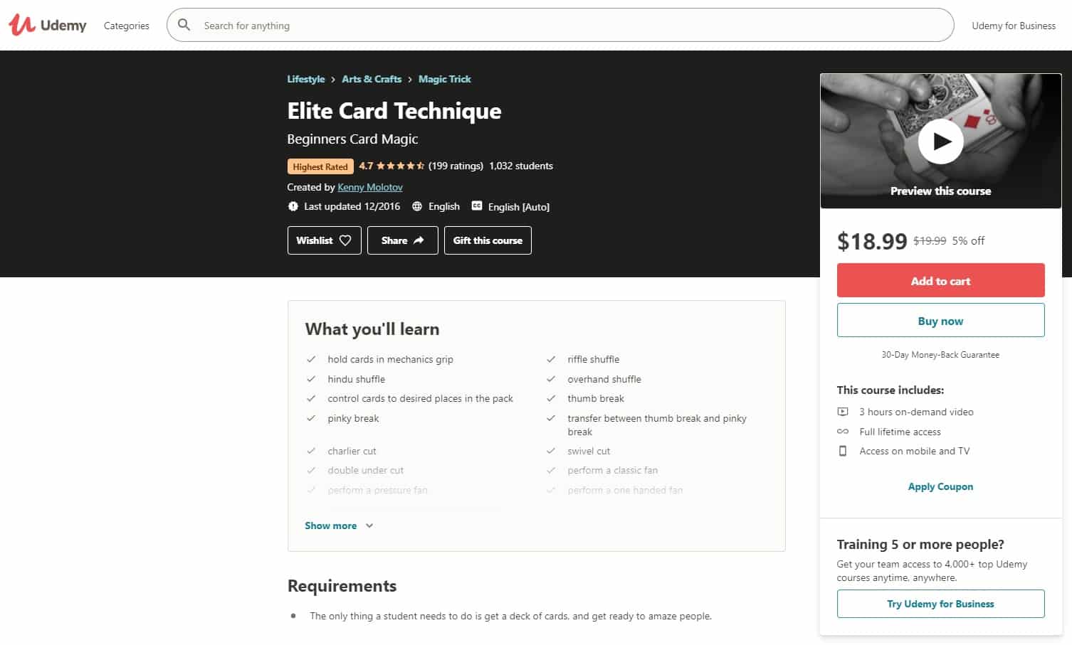 Udemy.com is a perfect option for aspirant magicians who want to learn new magic skills and tricks. They have designed the Elite card technique course for everyone who wants to master the card tricks. There are 987 students enrolled in the course and are created by the maestro, Kenny Molotov. With this course, you will learn the riffle shuffle, along with the Hindu shuffle, overhand shuffle, and thumb break.